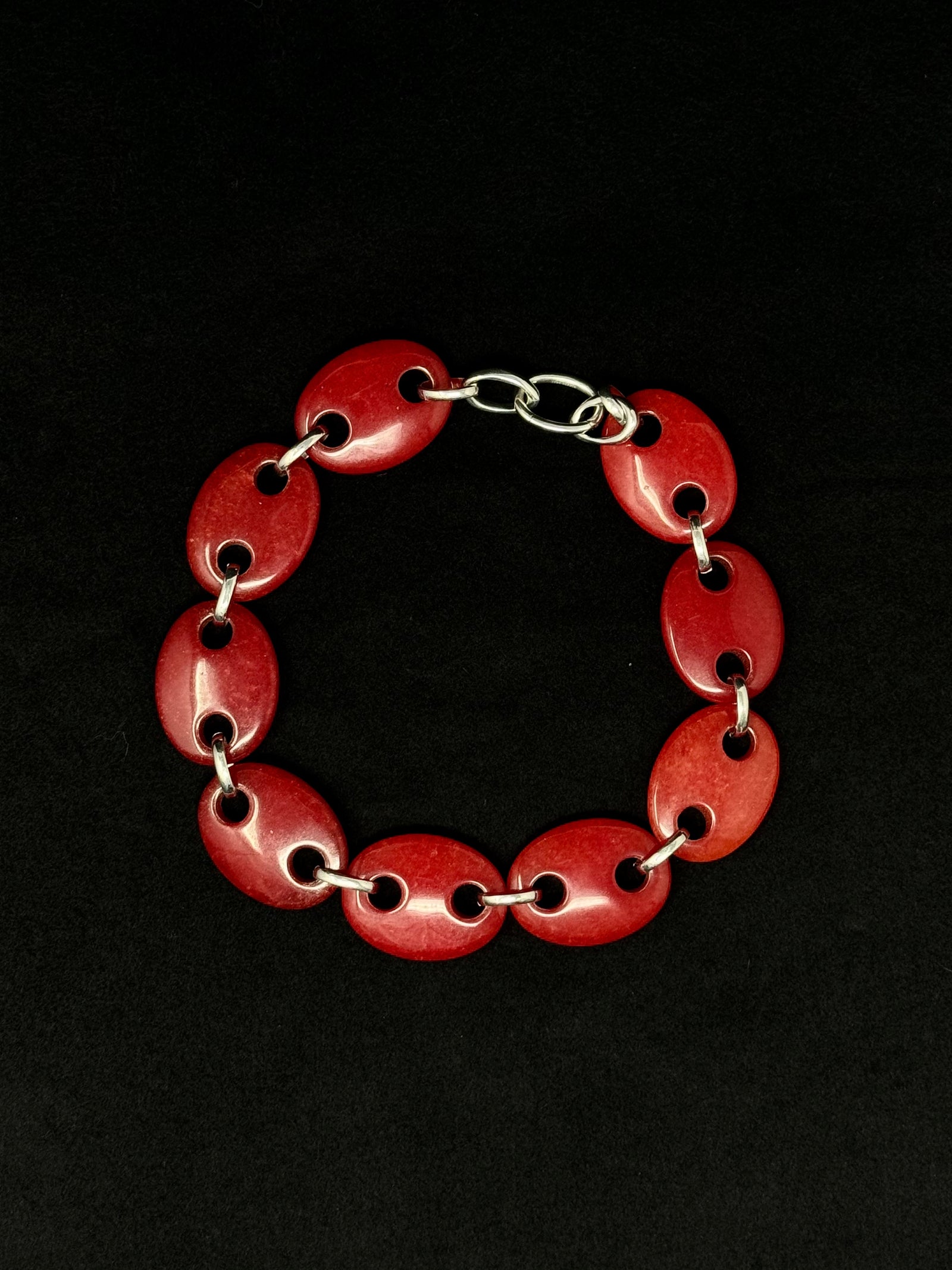 Rhodium plated 925 sterling-silver link chain necklace with custom red jade beads.