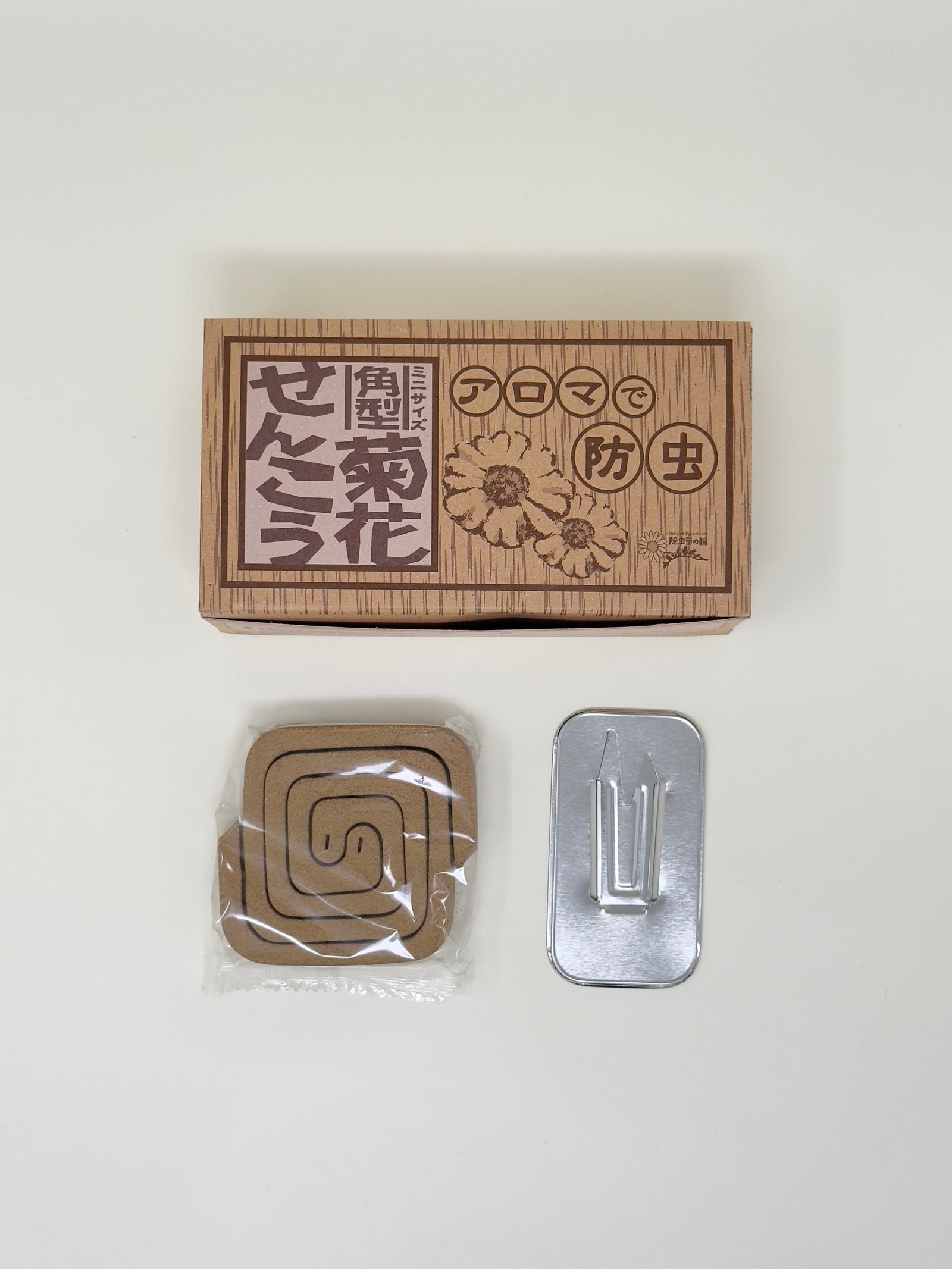 Kikka Senkō is all natural mosquito-repelling incense. These incense coils contain powdered flowers of pyrethrum daisies, which have pyrethrins, natural compounds with insecticidal properties. The scent is a natural wood burning smell.