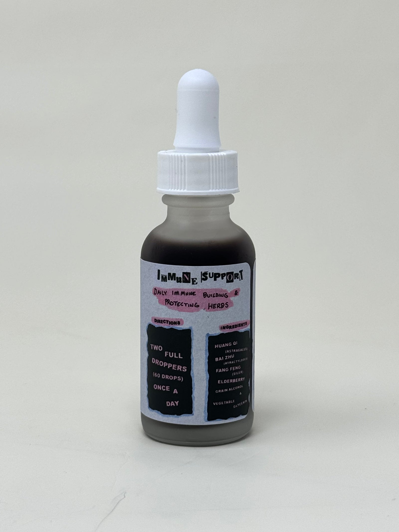 Ingredients: Huang Qi (astragalus), Bai Zhu (atractylodes), Fang Feng (siler), elderberry, vegetable glycerin, and grain alcohol.