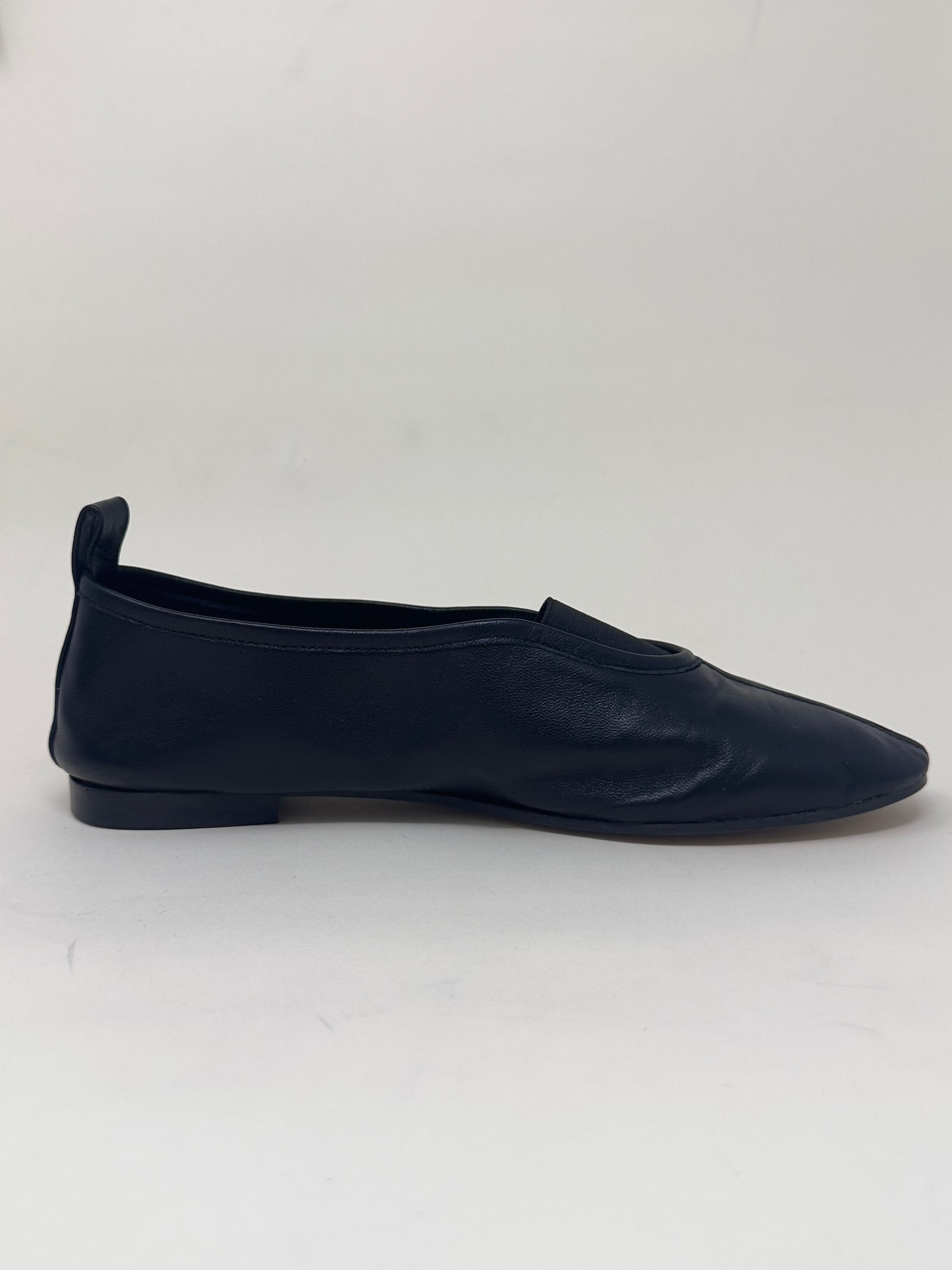 Unlined flats made of super soft white lamb leather. This dance inspired shoe features a rounded toe and an elastic band on the center.