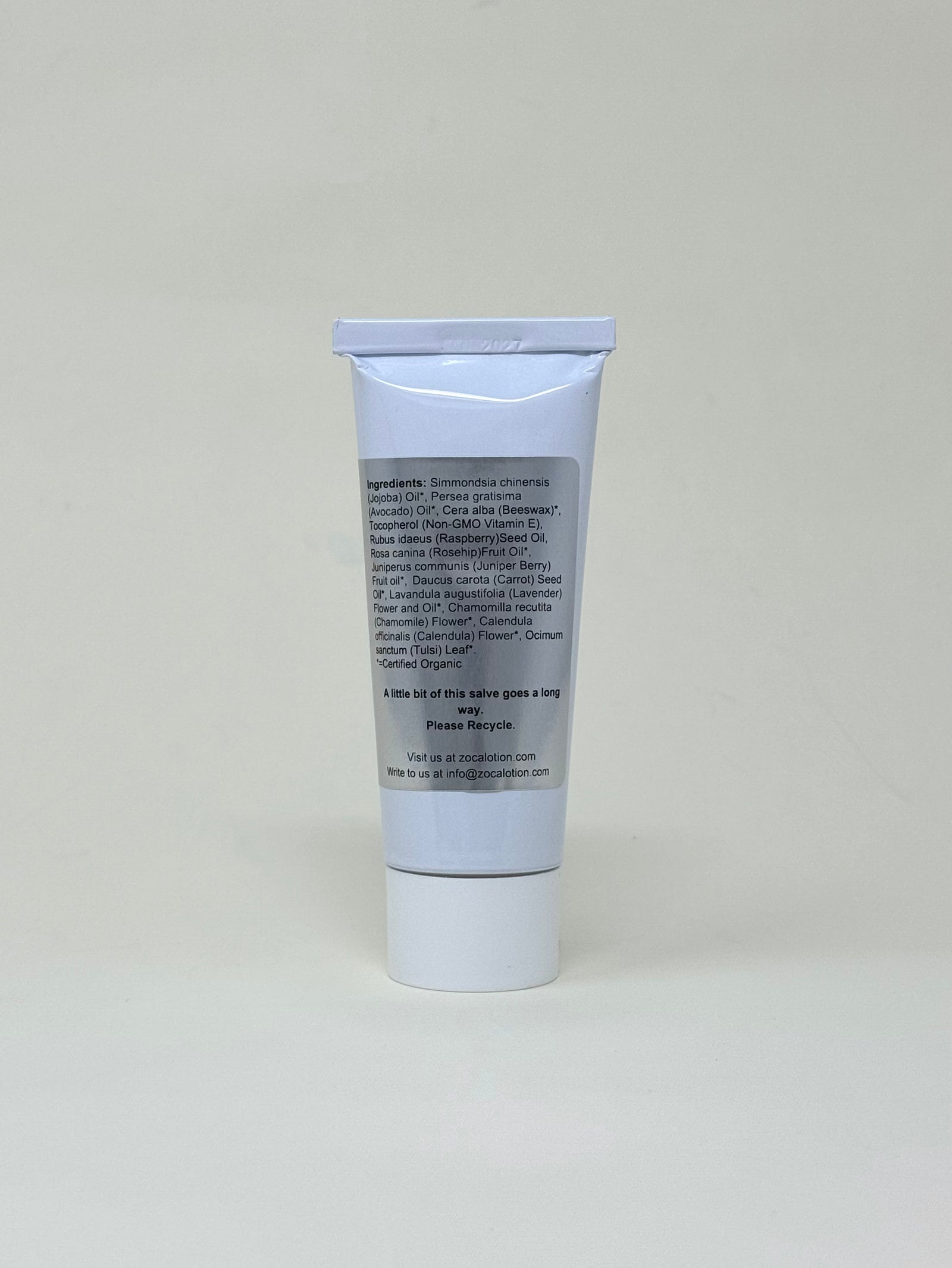 Ingredients:  Simmondsia chinensis (jojoba) seed oil*, Persea gratisima (avocado) oil*, Cera alba (beeswax)*, Butyrospermum parkii (fair trade shea) butter*, Tocopherols (non-GMO vitamin E) oil*, Rosa canina (rosehip) oil*, Rubus idaeus (raspberry) seed oil, Juniperus communis (juniper) berry oil*, Daucus carota (carrot) seed oil*, Lavandula augustafolia (lavender) flower*, Chamomilla recutita (chamomile) flower* Calendula officinalis (calendula) flower*.
