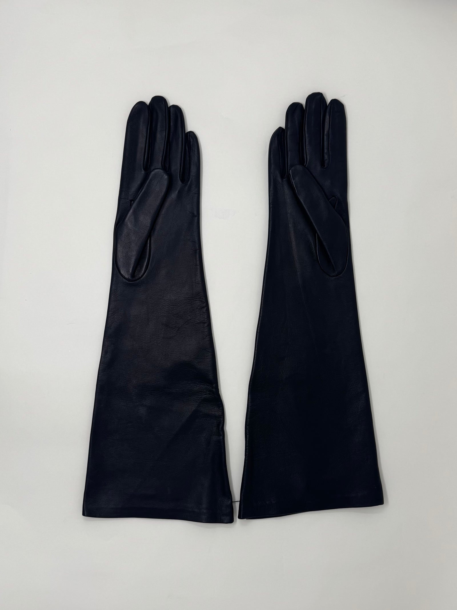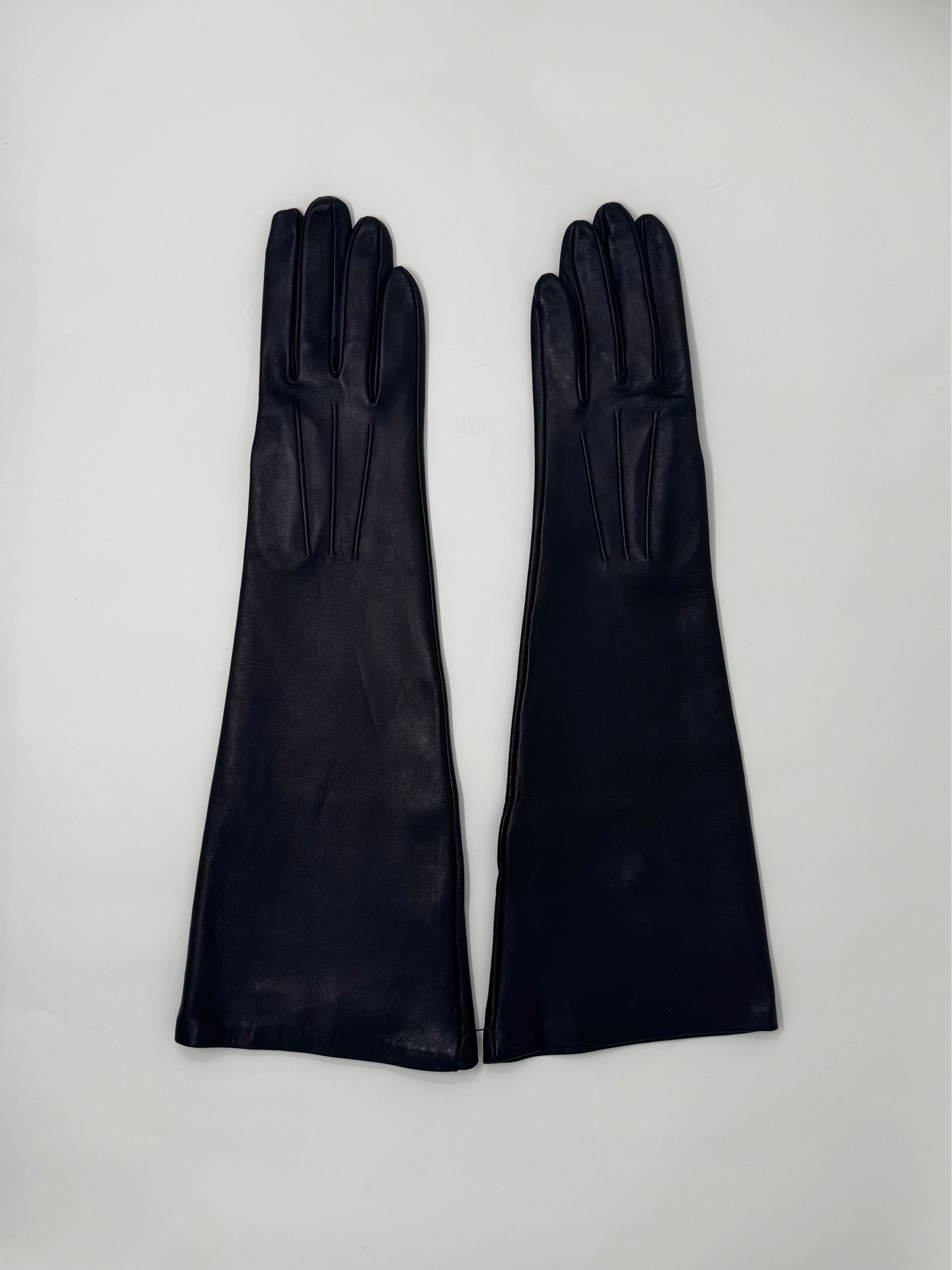 Slouched oversize wrist glove, three-point stitch detail on hand, fine silk knit lined, smooth, warming.