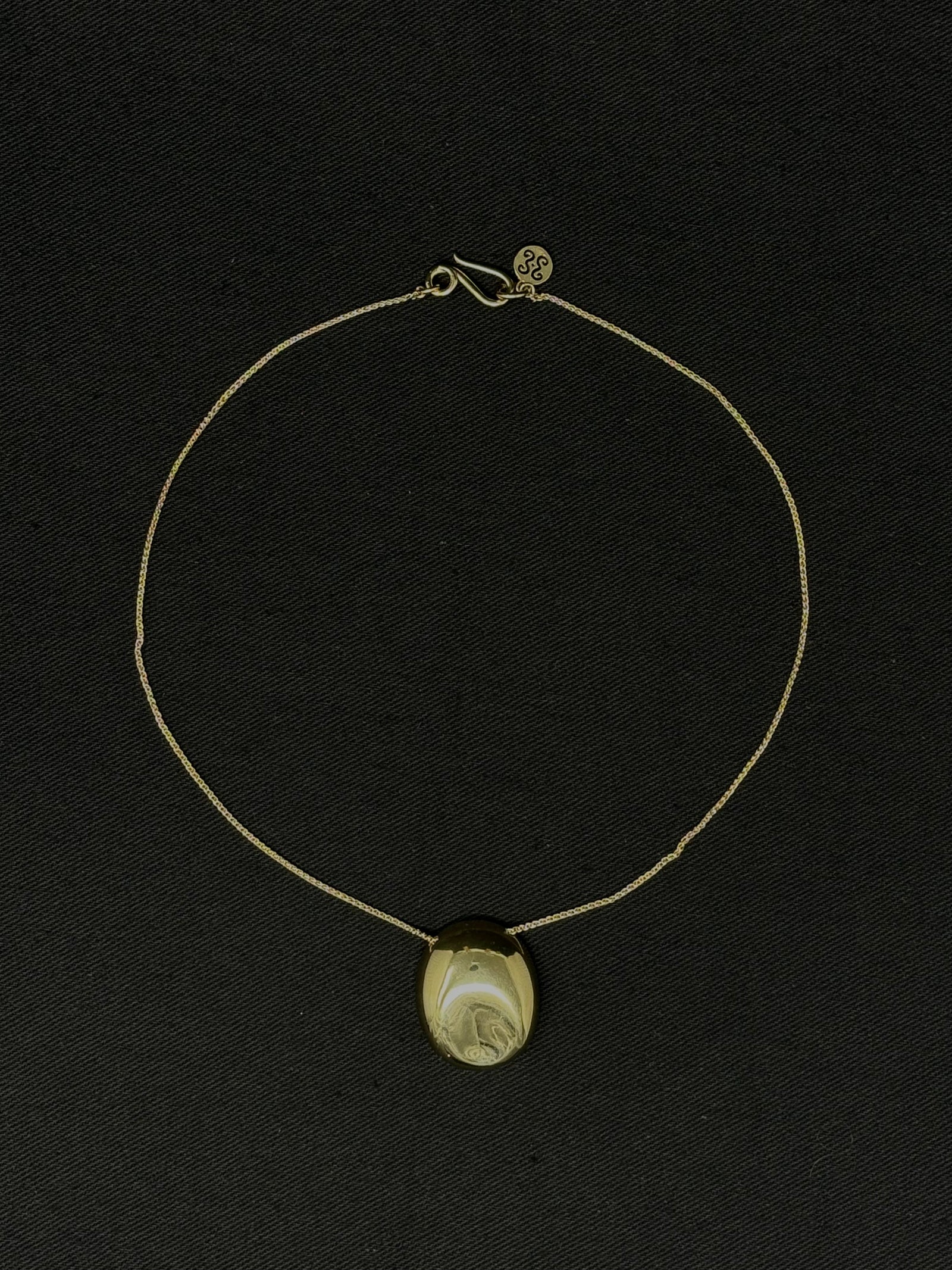 A massively oversized element is suspended from a dainty spiga necklace, creating a fascinating "imbalance".